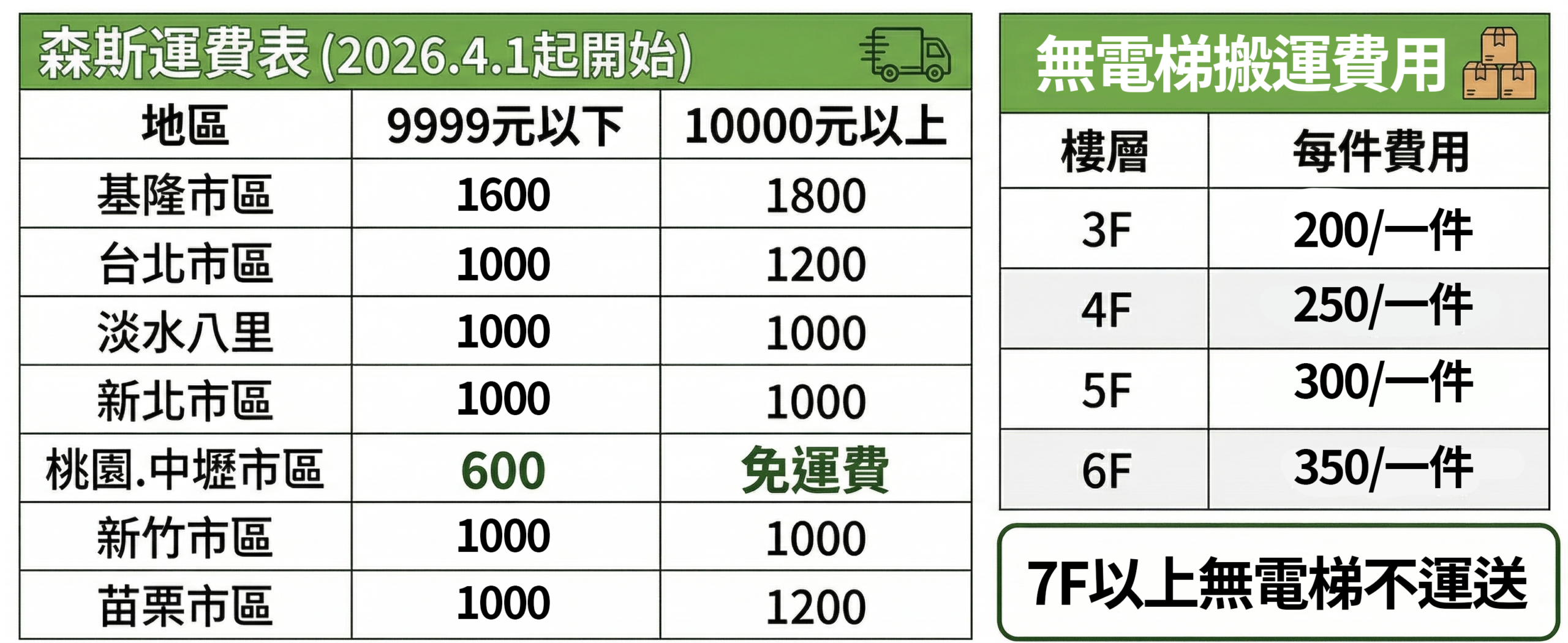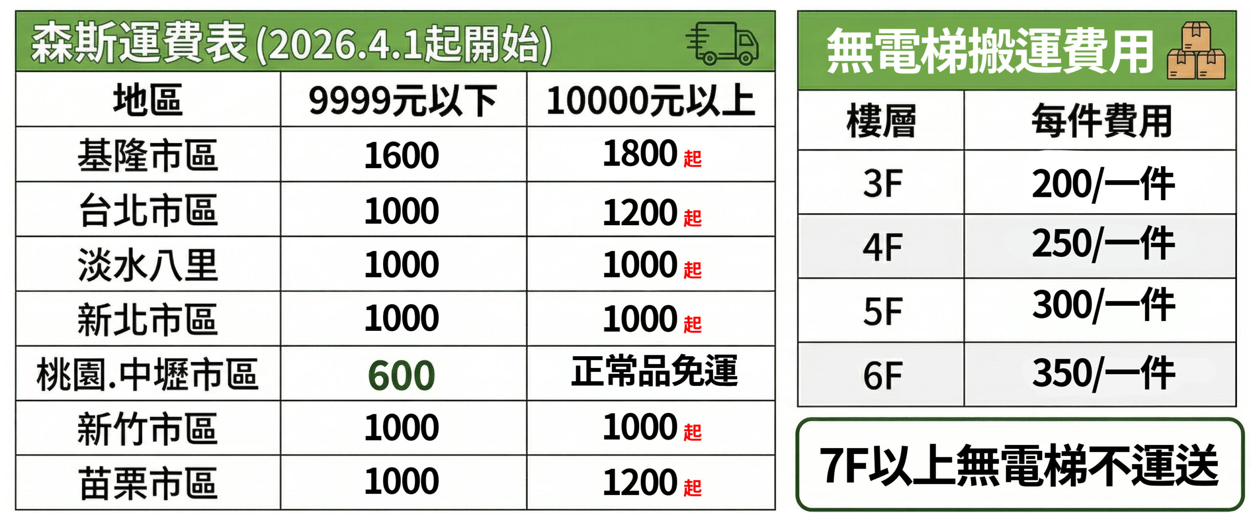 *樓層費用計算,訂單只要送超過三樓(含三樓)以上的樓層,【每項商品】都要再多收樓層費用